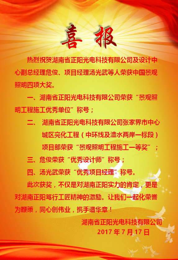 熱烈祝賀湖南省正陽光電科技有限公司及設計中心副總經理危俊、項目經理湯光武等人榮獲中國景觀照明四項大獎!